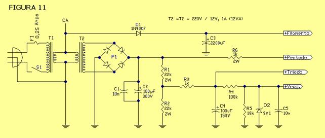 Se ha elegido la tensión de filamentos de 12V porque es próxima a la especificada por el fabricante de la válvula y es fácil encontrar transformadores de este tipo. Después de algunas pruebas se ha escogido alimentar el filamento con CC ya que elimina cualquier rastro de alterna en los auriculares. Los filamentos se llevan nada menos que 3,4 W.