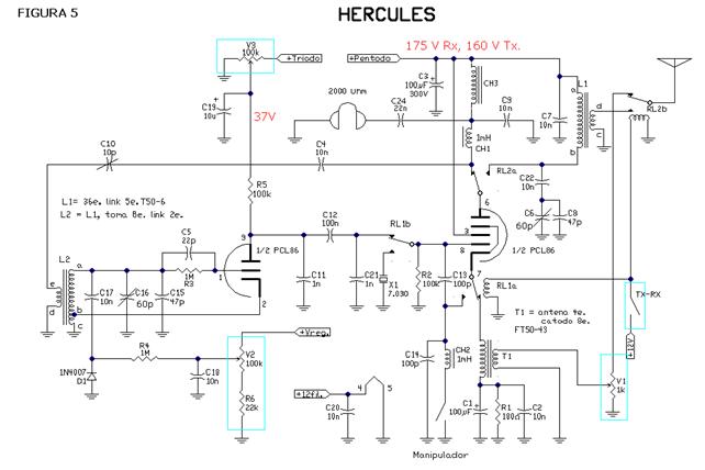 Cuando se activan los relés el pentodo entra en modo TX de forma que el cátodo (7) realimenta la reja de mando por medio del divisor formado por C13 y C14, entrando en oscilación el cristal cuando el manipulador esta cerrado. La placa (6) queda conectada a la bobina L1 que esta sintonizada por los condensadores C6 y C8. C22 protege de la AT, por lo que los condensadores de sintonía pueden ser de baja tensión. Para emitir en una sola frecuencia (y sobre 50 Ω) no es necesario usar condensadores variables con mando.